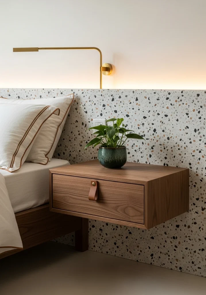 A slim brass reading arm and small emerald plant in a glazed pot complete the bedside setup. Warm wall washing highlights those terrazzo flecks and makes everything glow.