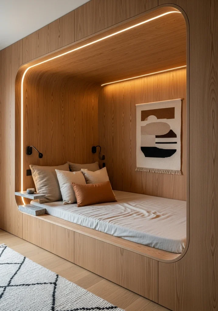 A sleeping niche formed by curved timber paneling in warm ash creates this cocooning effect. The mattress sits on a low platform dressed with layered oatmeal and clay-tone pillows, while a narrow stone-top side shelf provides practical storage.