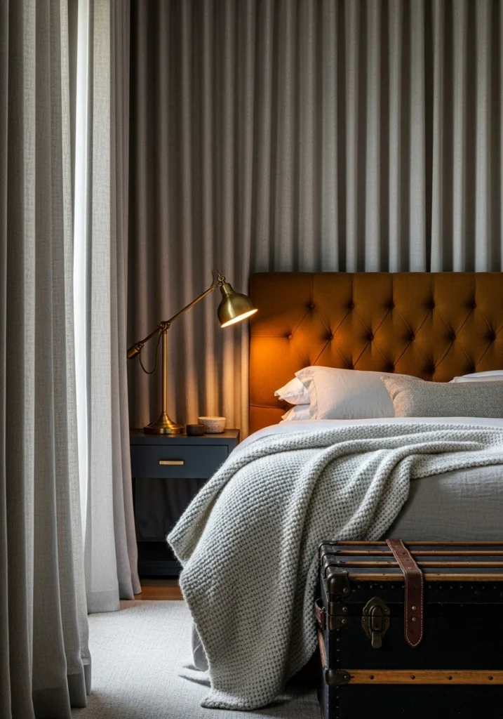 A low wooden trunk at the foot of the bed with leather straps adds storage and vintage charm, while a neutral boucle throw provides cozy texture. Warm bedside glow complemented by cool morning fill creates balanced lighting.