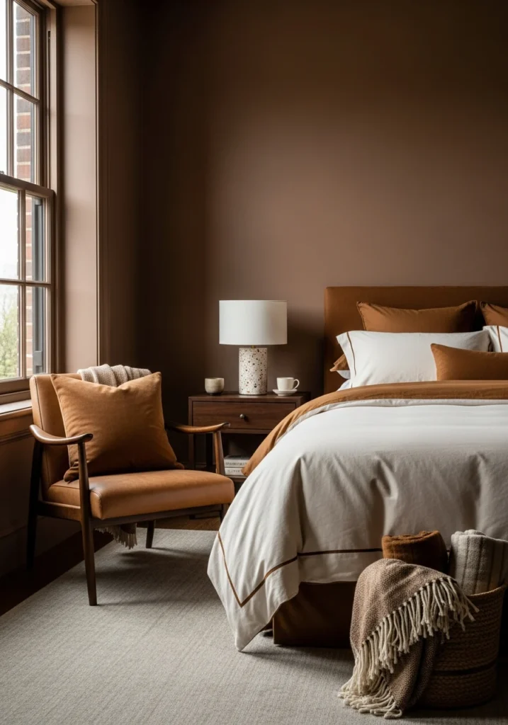 Tonal brown layering creates depth without adding visual noise—mocha-painted walls, toffee leather accent chair, caramel suede cushions, cream duvet with warm-brown border. A terrazzo bedside lamp and woven basket for throws add texture.