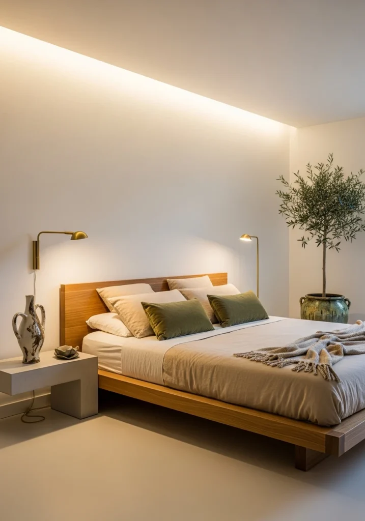 A minimal low plinth bed in warm-stained oak keeps the profile low and modern. Crisp sand linens get punched up with olive-hued accent pillows, while a slim concrete bedside plinth holds a sculpted ceramic piece.