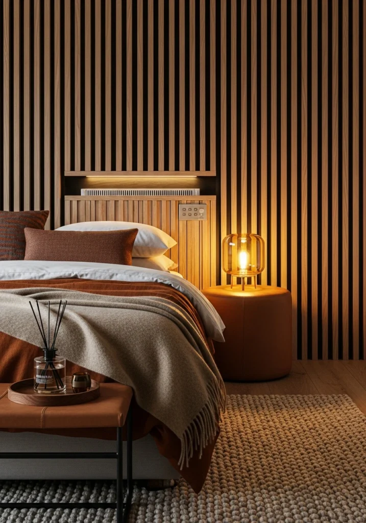 The slightly lowered composition highlights that slat feature and cozy warmth. This is smart design—solving practical problems while looking beautiful.