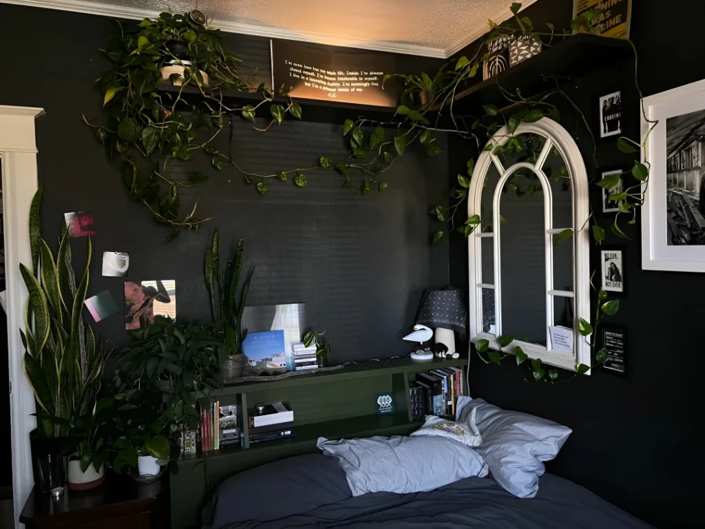 u/lexitrobe22went bold with dark walls and a dark green headboard with built-in shelving, then softened everything with abundant trailing plants. That dramatic white arched mirror reflects light and makes the space feel bigger.