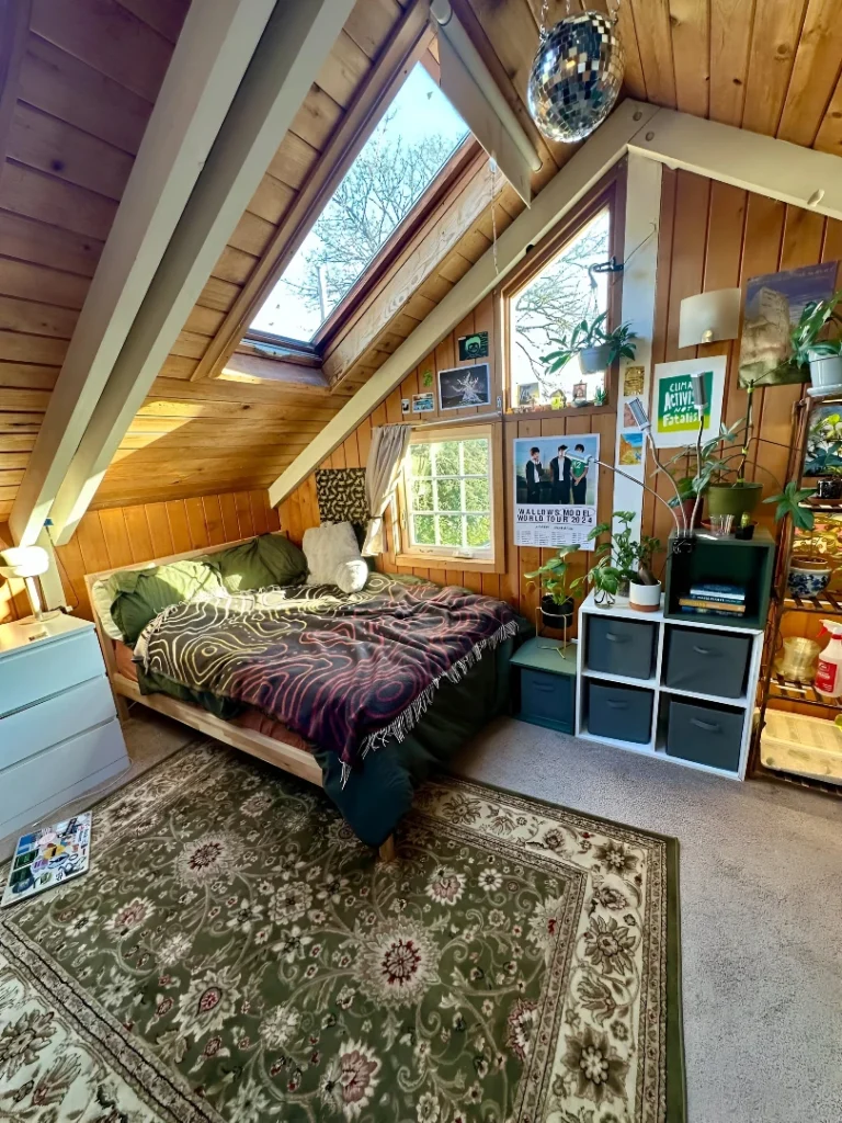 u/RespondWrong8993 made the most of this attic space with that stunning wood paneling on the angled ceiling and walls. The skylight floods the room with natural light, while that patterned green rug adds color and grounds the bed.