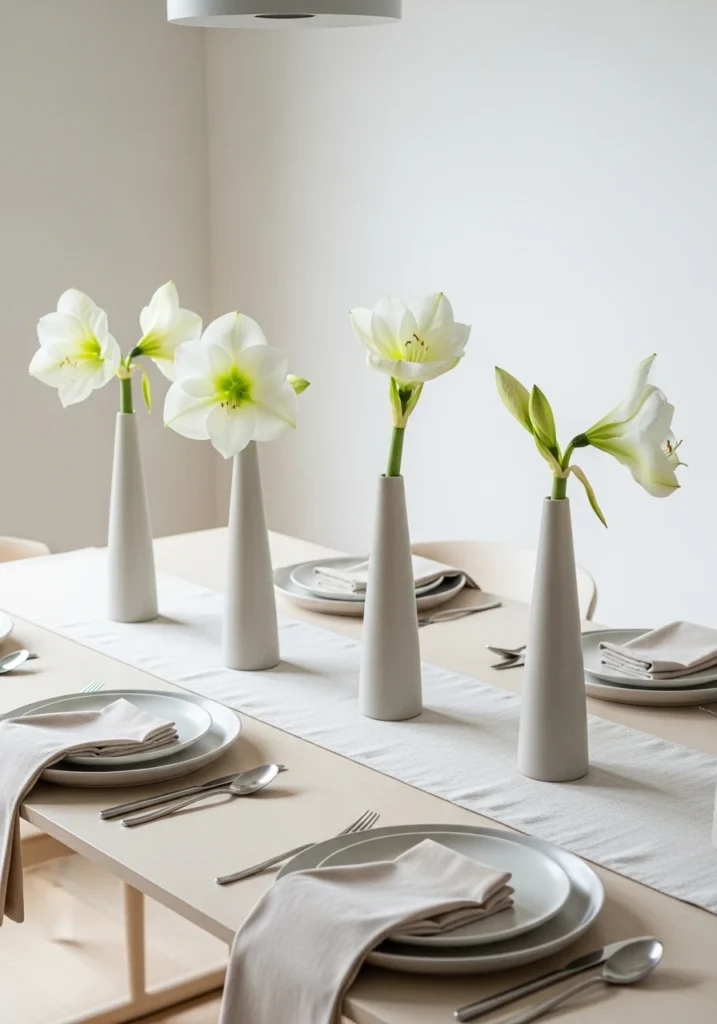 A pale-ivory lacquer table set with a single line of tall narrow matte-ceramic vases, each holding one oversized white amaryllis, creates sculptural rhythm without clutter. A low ivory linen runner grounds the arrangement. Handmade porcelain plates with thin matte-gold rim, minimal matte-silver flatware, and ivory velvet napkins folded simply maintain the restrained aesthetic. Soft diffuse daylight combined with a single low pendant creates intimacy. This minimalist approach proves that sometimes the most impactful tablescapes are the ones that know when to stop—less is absolutely more here.