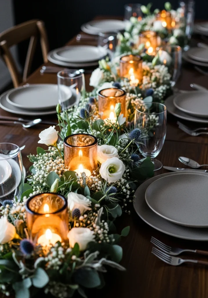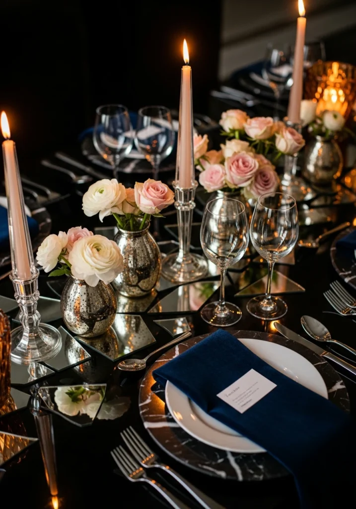 Mirrored runner shards laid intermittently along a dark table create reflective intrigue. Mixed mercury-glass low vessels with white ranunculus and pale-pink spray roses catch light beautifully. Tall tapered clear crystal candlesticks add height. Black-marble chargers provide dramatic grounding. Polished silver flatware and deep-navy velvet napkins complete the picture. Warm amber candlelight dominates the mood with subtle cooler pin lighting creating depth. This crystal-and-mercury approach works because reflective surfaces multiply light and create visual interest without requiring more flowers or accessories—it’s about working with what catches light.