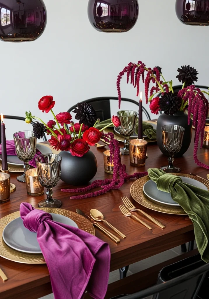 Deep-wood tables set with jewel-toned velvet napkins in aubergine and bottle green create rich, luxurious immediately. Filled low matte-black vases with ruby ranunculus, black dahlias, and dark burgundy amaranth feel both seasonal and sophisticated. Hammered-brass chargers catch warm light. Smoky crystal glassware and warm brass flatware tie the warm metals together. Low votives scattered throughout create candlelit pools of intimacy. Dim 3000K pendant lighting makes the jewel tones glow rather than feel heavy. This jewel-tone approach shows how deep florals and rich materials create luxury without requiring pastels or silvers.