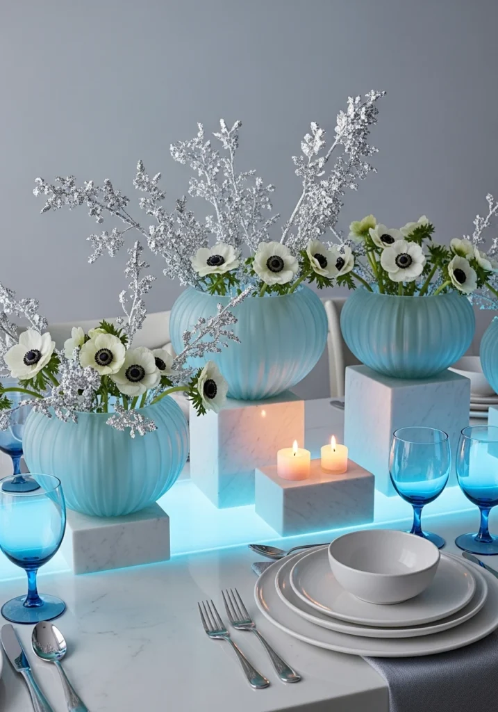 Frosted pale-blue blown-glass bowls as centerpieces filled with white anemones and dusted silver-leaf branches create a cool-toned moment. White marble small plinths vary the heights naturally. Cool-blue accent LED under-table wash balanced with warm candlelight creates visual temperature play. White stoneware plates and cool polished-silver flatware maintain the cool palette. Translucent blue water goblets echo the centerpiece color. This ice-blue approach works because cool tones feel inherently winter without requiring frost or snow—the glass and silver-leaf create the icy effect naturally.