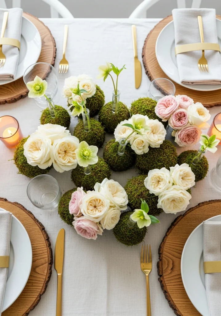 Organic groupings of small hand-formed peat-moss pods interspersed with clusters of garden roses in cream and blush create textural interest. Tiny glass tubes with single hellebore stems poking through moss add delicate detail. Raw-edge oak chargers bring warmth and natural texture. Brass butter knives and linen napkins maintain the organic aesthetic. Soft side window light combined with warm candle accents creates flattering illumination. This moss-pod approach shows how natural, tactile materials create interest without requiring a lot of florals—sometimes less arrangement and more layering of textures works better.