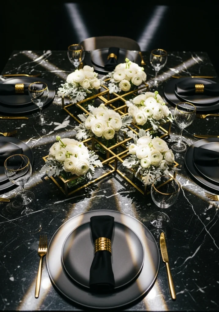 A black marble tabletop hosts a central geometric brass sculpture (hollow trays) with compact white ranunculus and silver-gray dusty miller creating height and focus. Matte-black chargers ground the place settings. Gold-rimmed stemware adds warmth. Tailored black linen napkins with brass napkin rings echo the hardware. Focused spotlights above create crisp shadow geometry. This geometric-metallic approach works because the sculpture becomes functional art—it holds flowers while also serving as the table’s focal point.