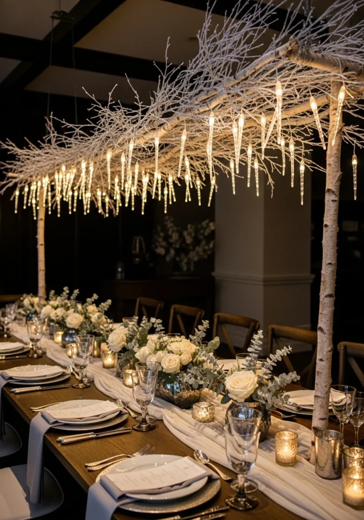 A long banquet table with an overhead suspended canopy of frosted birch branches and micro LED “icicle” lights creates architectural drama. Beneath it, low vessels with cream roses and silvered eucalyptus provide ground-level interest. Pale-linen runners, hammered-silver flatware, and slightly antiqued glassware complete the picture. Warm 3000K uplight on the branch undersides creates soft downward glow. This frosted-canopy approach shows how overhead elements transform a table—suddenly you’re dining under a winter forest rather than just at a table decorated with branches.