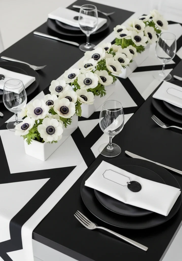 A matte-black table with crisp white geometric runner creates bold graphic contrast. A single low row of white anemones in rectangular white ceramic troughs runs down the center. Black porcelain chargers, satin steel flatware, and crisp folded white napkins with black wax-sealed tags maintain the graphic aesthetic. Cool gallery lighting emphasizes the contrast. This minimalist-black-and-white approach proves that graphic design principles work beautifully for weddings—sometimes the boldest move is restraint and contrast rather than decoration.