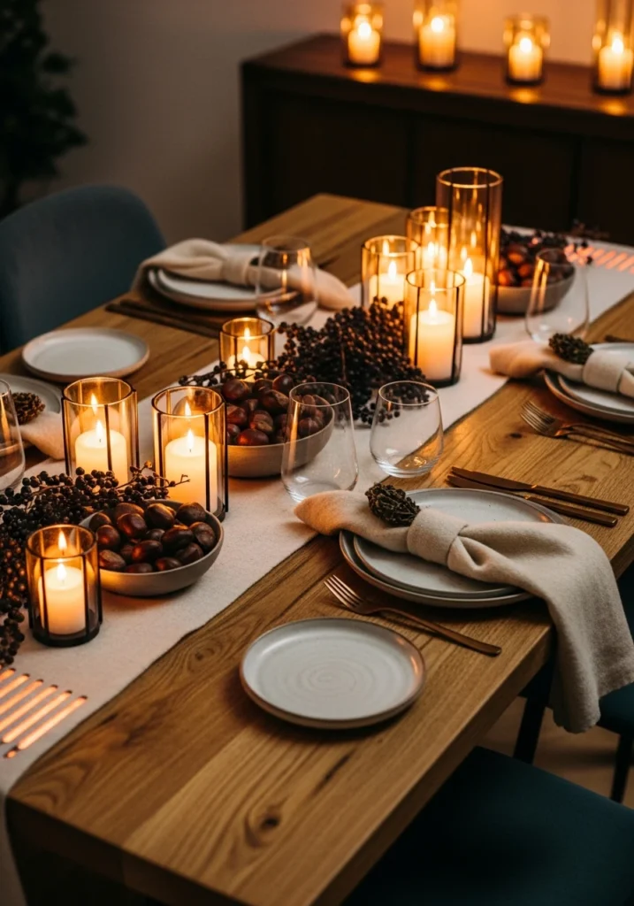 A natural-wood table dressed with a runner of halved blood oranges, whole kumquats, sprigs of rosemary, and small cedar boughs creates edible-meets-decorative appeal. Low neutral ceramic plates and raw-edged slate chargers keep focus on the citrus colors. Warm hammered-brass flatware and clear stemware with amber votives warm the citrus coolness. Morning light creates fresh sheen on the fruit. This citrus-and-pine approach shows how actual food can be tablescape decor—it looks beautiful and smells incredible, plus it’s less wasteful than flowers alone.