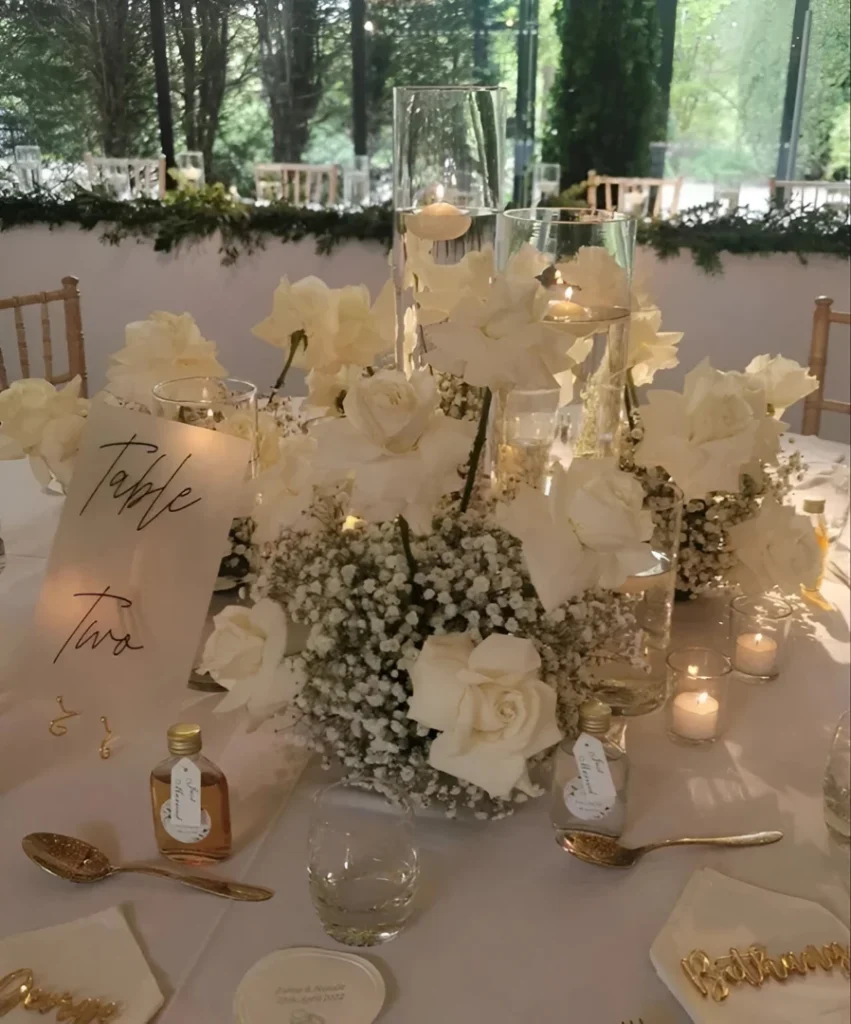 A long elegant table set in white with abundant cream-and-white florals, baby’s breath filling space between roses, tall glass hurricanes with pillar candles, and gold-accented chargers creates classic romance. u/MindlessYou7806 kept the florals lush and generous, filling the entire table length. Glass vessels and clear candlesticks create reflective surfaces. Table signs hand-written like “Table Two” and other markers add personalization. Gold spoons and sophisticated detailing show attention to every element. This abundant-white approach shows how generous florals and generous scale create the feeling of a celebration—nothing feels sparse or pinched.